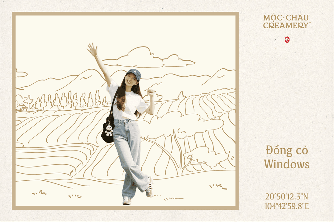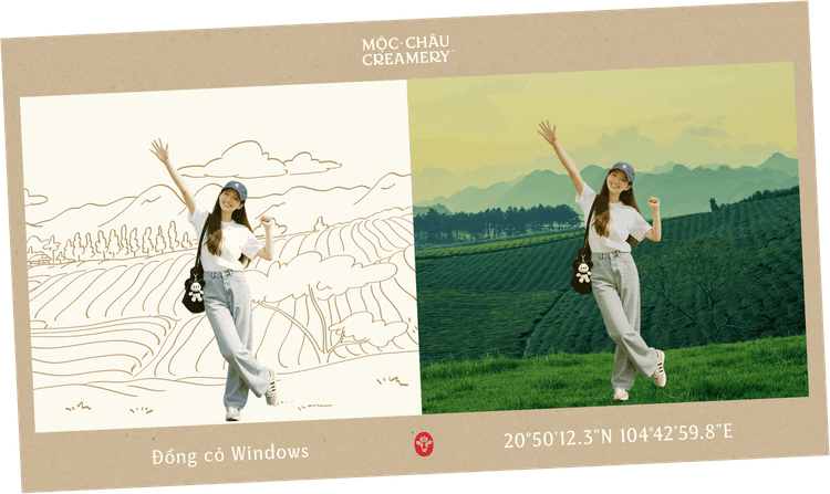 Tạo tấm bưu thiếp chia sẻ hành trình tại Mộc Châu bằng cách ghép bức ký họa cùng ảnh check-in của bạn.